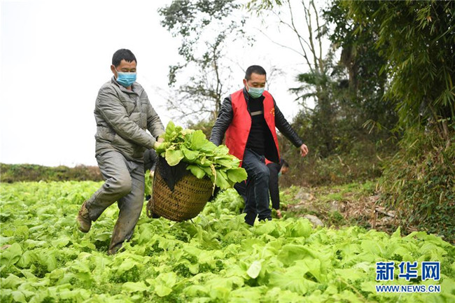 2月8日,菜農(nóng)(左)和鄉(xiāng)村蔬菜配送小隊(duì)志愿者在地里采收蔬菜。新華社記者 唐奕 攝