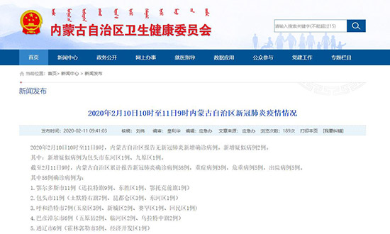 2月11日,記者從內(nèi)蒙古自治區(qū)衛(wèi)生健康委員會獲悉,2020年2月10日10時至11日9時,內(nèi)蒙古自治區(qū)報告無新冠肺炎新增確診病例。新增疑似病例2例。