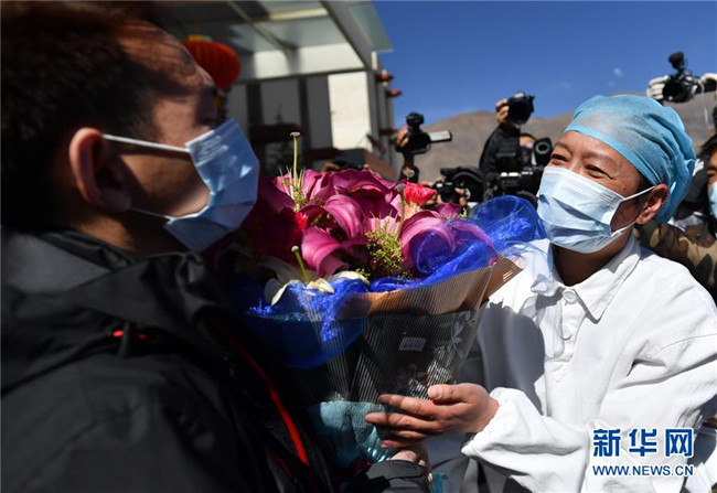 2月12日,在西藏自治區(qū)第三人民醫(yī)院,主治醫(yī)生花德米為出院患者送上鮮花。新華社記者 覺(jué)果 攝