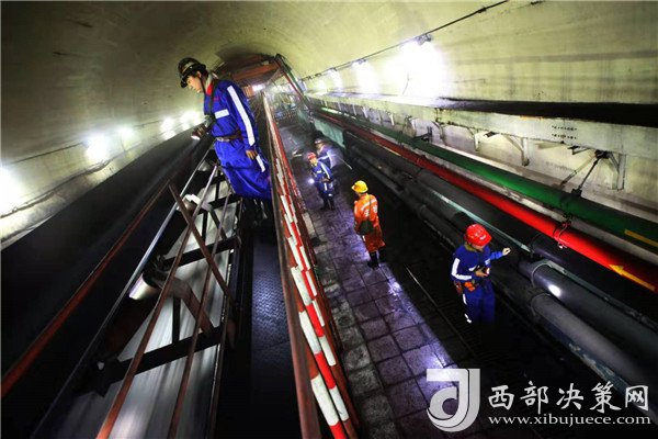 井下工人正在巡檢運轉(zhuǎn)的皮帶