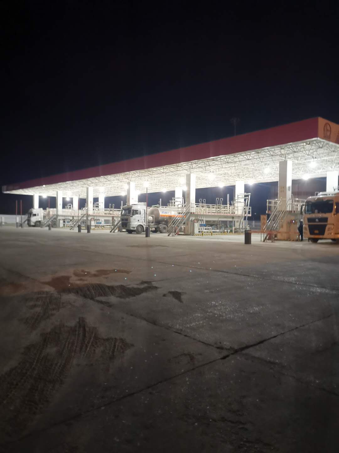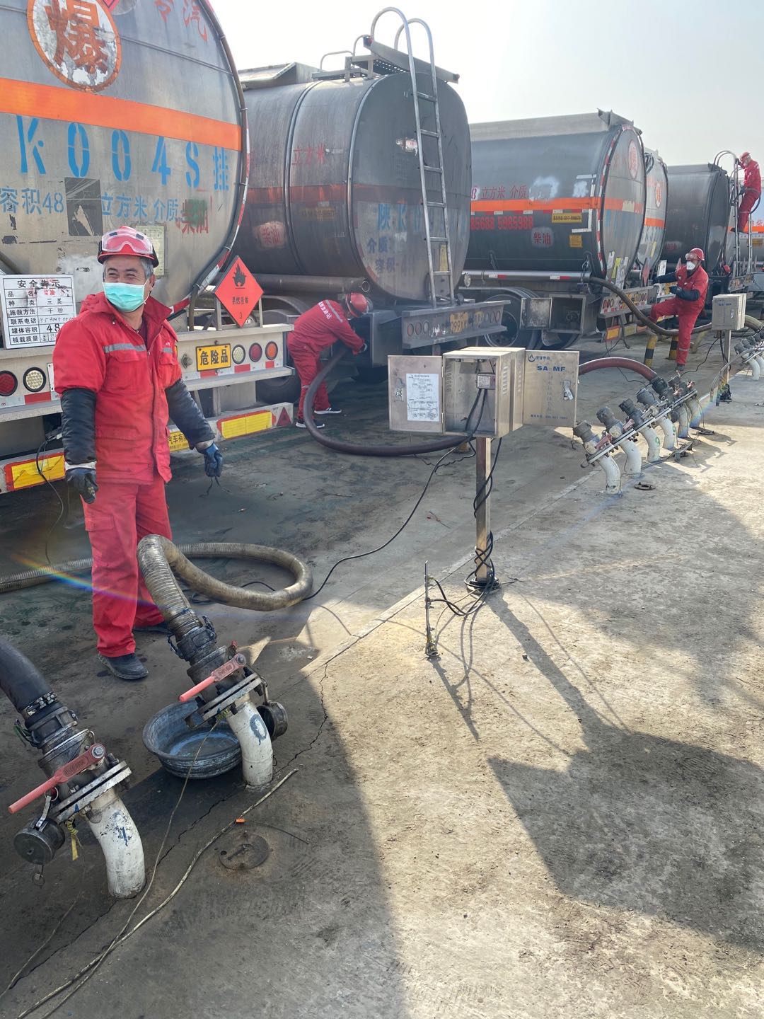已近零時(shí),空曠的付油區(qū)氣溫早已降至零攝氏度以下。此時(shí),油庫的發(fā)油作業(yè)依然沒有停止……油庫的幾名工友,頭戴紅色安全帽、身著藍(lán)色工裝,對(duì)入庫油庫油車進(jìn)行安全檢查,驗(yàn)票員仔細(xì)核對(duì)著票據(jù)信息,引導(dǎo)車輛正確??浚粩嗵崾抉{駛員注意操作安全。