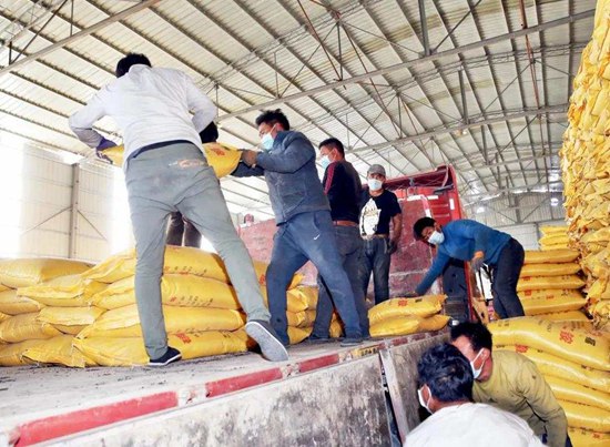 西藏農(nóng)投集團(tuán)化肥倉(cāng)庫(kù)現(xiàn)有庫(kù)存2萬(wàn)多噸化肥,工人們正在忙碌搬運(yùn)。西藏日?qǐng)?bào)記者 姚海全 攝
