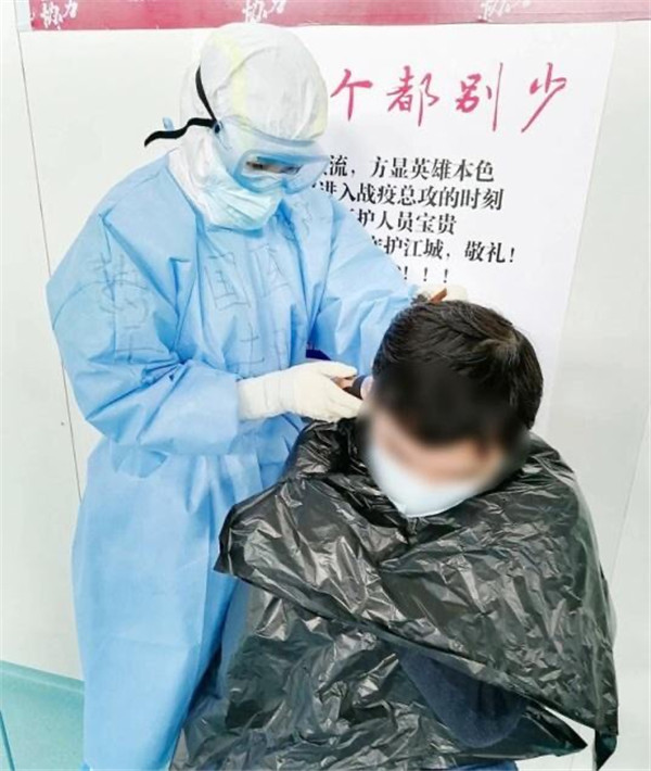 1艙有康復(fù)人員想理發(fā),手頭沒有工具,朱晴護士長得知后,聯(lián)系下個班次護士帶來推子,給大家理發(fā)。“看你動作很嫻熟啊,以前練過的吧”,“圍觀群眾”打趣道。“現(xiàn)學(xué)現(xiàn)賣,大家要求不要太高,有壓力??!”朱晴說。一直推到推子沒電,朱晴給6位康復(fù)人員簡單修剪了頭發(fā)。得知朱晴是西安醫(yī)療隊的護士,大家都親切的稱她“肉夾饃”!