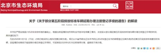 近日,北京市生態(tài)環(huán)境局發(fā)布《關(guān)于<關(guān)于部分第五階段排放標(biāo)準(zhǔn)車輛延期辦理注冊(cè)登記手續(xù)的通告>的解讀》指出,凡在2020年1月1日之前已購買的、或已從外省市轉(zhuǎn)出遷往本市的符合“國五”排放標(biāo)準(zhǔn)要求的車輛,因疫情防控期間不能按期辦理注冊(cè)登記手續(xù)的,可延期至2020年6月30日前繼續(xù)辦理,逾期將不再辦理。