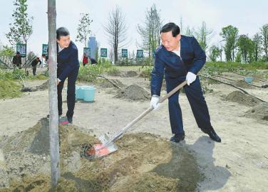 四月八日,四川省委書(shū)記彭清華到成都市調(diào)研公園城市建設(shè)推進(jìn)情況。在天府中央公園,彭清華與天府新區(qū)干部群眾一起植樹(shù)造林,為公園城市建設(shè)再添一抹綠、貢獻(xiàn)一份力。記者 歐陽(yáng)杰 攝
