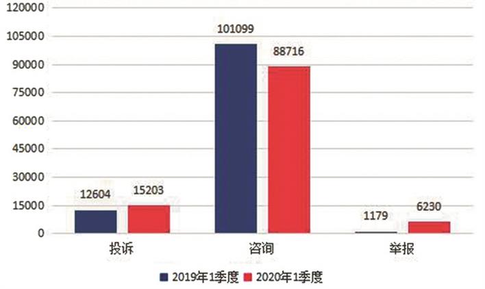 一季度,全省共受理消費者投訴15203件,與2019年同期相比上升了20.6%。其中商品類投訴7635件,與2019年同期相比上升了39.3%,服務類投訴7568件,與2019年同期相比上升了6.3%。