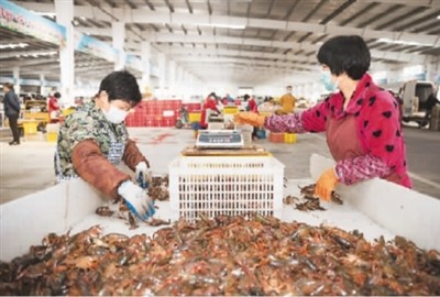 走進湖北潛江小龍蝦交易中心,眼前一派忙碌景象。500多家水產商戶已經復工,工人們忙著分揀包裝,成箱的小龍蝦被裝上物流車輛,運往全國各地。