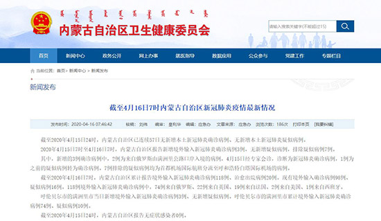 2020年4月15日7時至4月16日7時,內(nèi)蒙古自治區(qū)報告新增境外輸入新冠肺炎確診病例3例,無新增疑似病例,排除疑似病例7例。