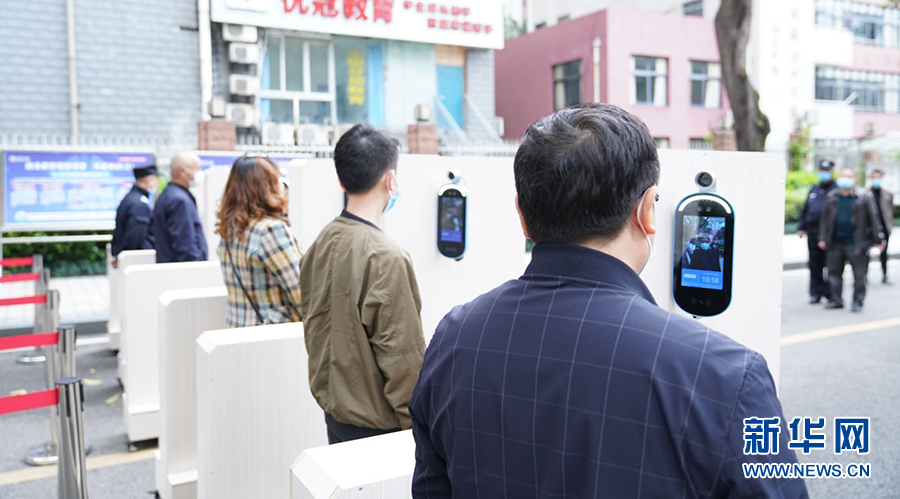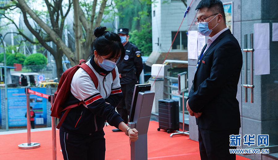 在重慶市第一中學(xué),大校門設(shè)置了多條紅外線成像體溫測控通道,能夠快速檢測到師生體溫并清楚顯示。學(xué)生從通道經(jīng)過時,紅外線測溫儀會及時監(jiān)測通過者體溫,若有體溫異常者,設(shè)備會報警。圖為學(xué)校老師演習(xí)進(jìn)校場景。新華網(wǎng)發(fā)