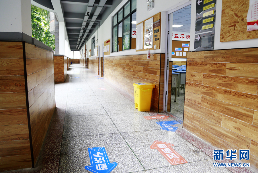 在重慶市第十一中學(xué),為避免人流聚集,在公眾通道處學(xué)校設(shè)置了行進(jìn)方向指示標(biāo)識以引導(dǎo)師生。新華網(wǎng) 彭博攝