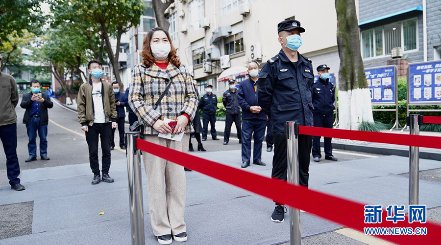 在重慶市第一中學(xué),學(xué)生返校時須由值班人員引導(dǎo)指揮,在校門外有序排隊,相互間保持一米的距離,并從專用通道依次有序進(jìn)入。圖為學(xué)校老師演習(xí)進(jìn)校場景。新華網(wǎng)發(fā)
