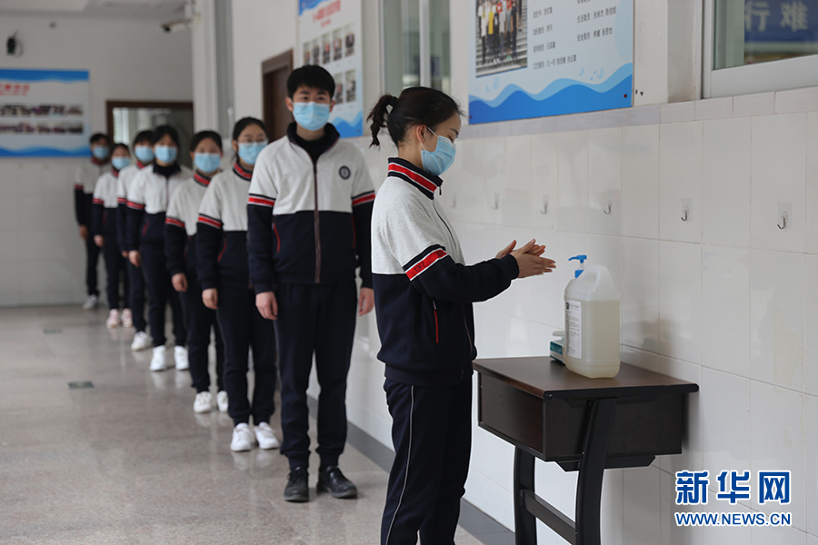 在西南大學(xué)附屬中學(xué),上課前學(xué)生需提前洗手,在教室外間隔1米左右排隊等待班主任檢查后進(jìn)入教室上課。班主任將戴好一次性醫(yī)用口罩和一次性手套逐一對學(xué)生進(jìn)行體溫檢查,并做好檢查登記。圖為學(xué)生演習(xí)進(jìn)教室環(huán)節(jié)。新華網(wǎng)發(fā)