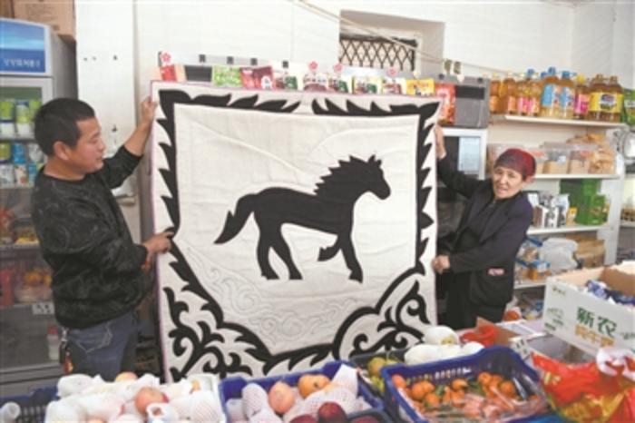 4月14日,在新疆托里縣多拉特鄉(xiāng)加瑪特村電子商務(wù)服務(wù)點負責人劉志江(左)與貧困戶馬合甫扎·阿勒木賽依提一起展示銷售的產(chǎn)品。 新華社記者 沙達提 攝