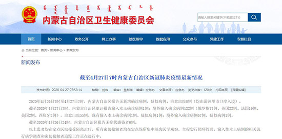 截至2020年4月26日24時(shí),內(nèi)蒙古自治區(qū)報(bào)告無(wú)癥狀感染者0例。