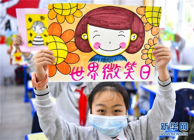 5月8日,江蘇省揚州市竹西小學的學生們手持笑臉卡片參加活動。 當日是世界微笑日。 新華社發(fā)(孟德龍 攝)