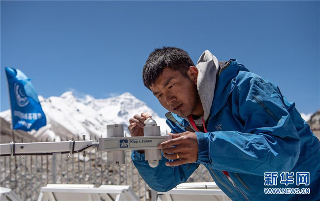 西藏自治區(qū)氣象局工作人員在珠峰大本營(yíng)自動(dòng)氣象站記錄氣象數(shù)據(jù)(5月10日攝)。新華社記者 普布扎西 攝