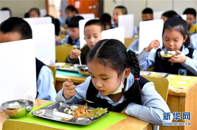 5月11日,陜西省西安市新城區(qū)后宰門小學(xué)一年級的學(xué)生在吃午飯。新華社記者 劉瀟 攝