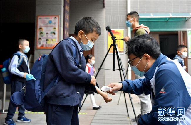 5月11日,陜西省西安市新城區(qū)后宰門小學(xué)的學(xué)生進(jìn)校時(shí)測量體溫。新華社記者 劉瀟 攝