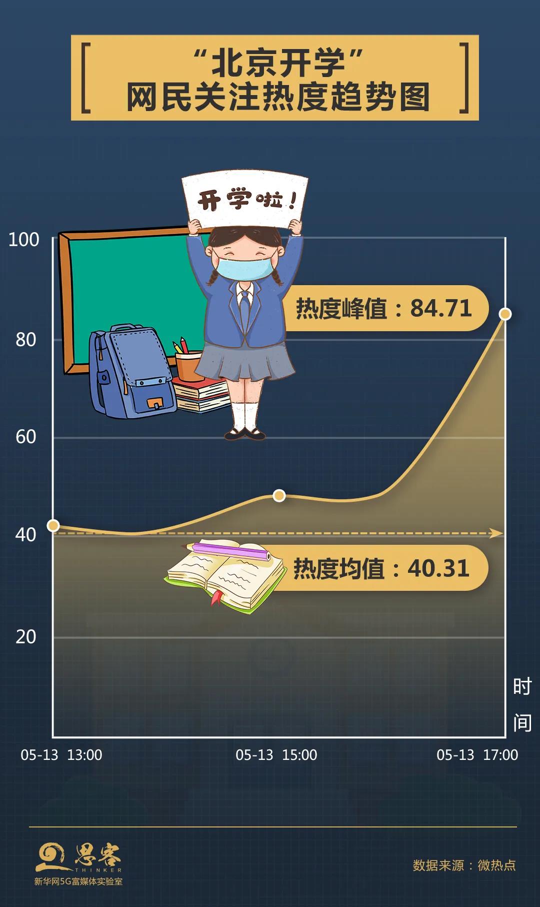 數(shù)據(jù)顯示,消息公布后,“北京開(kāi)學(xué)”話題的熱度指數(shù)迅速飆升,13日17時(shí)熱度指數(shù)達(dá)到84.71,“小學(xué)”“復(fù)課”“北京”是網(wǎng)民提及最多的詞。在相關(guān)討論中,“開(kāi)學(xué)后堅(jiān)持晨午晚檢制度”“開(kāi)學(xué)后錯(cuò)峰上學(xué)”“中小學(xué)暑假不會(huì)推遲”等話題關(guān)注度較高。
