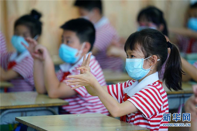 5月13日,廣西桂林市龍勝各族自治縣龍勝小學(xué)二年級(jí)的學(xué)生在“開學(xué)第一課”上學(xué)習(xí)洗手消毒方法。新華社發(fā)(黃勇丹 攝)