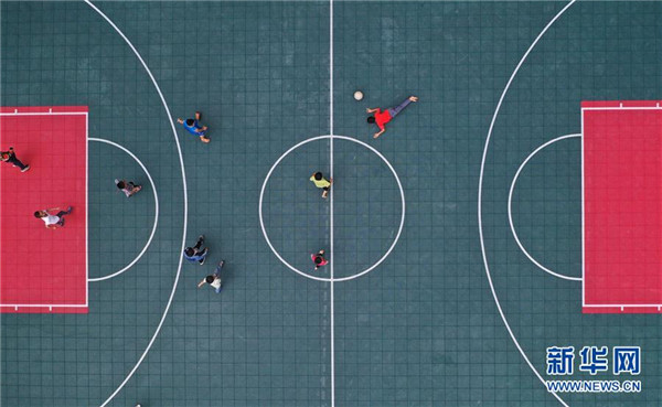 在廣西融水苗族自治縣桿洞鄉(xiāng)黨鳩小學,學生們在新球場上踢球(5月13日攝,無人機照片)。新華社記者黃孝邦攝