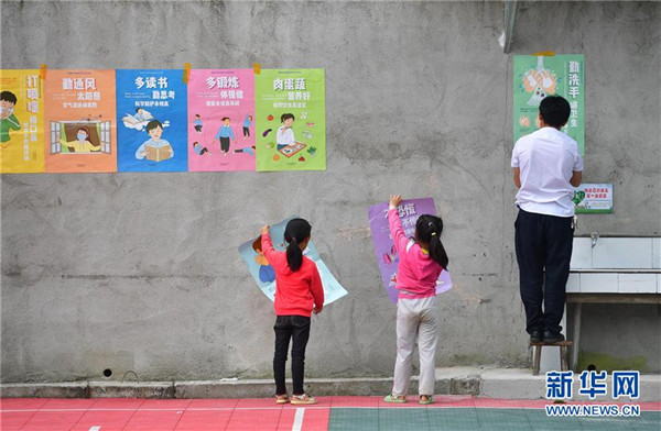 在廣西融水苗族自治縣桿洞鄉(xiāng)黨鳩小學,師生們在校園里張貼海報(5月13日攝)。新華社記者黃孝邦攝