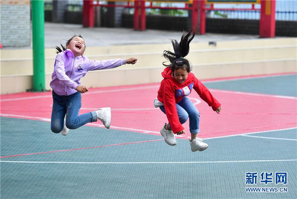 在廣西融水苗族自治縣桿洞鄉(xiāng)黨鳩小學,學生在新球場上跳繩(5月13日攝)。新華社記者黃孝邦攝