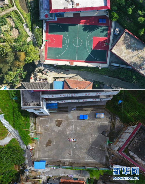 這張拼版照片的上圖為完成改造后的黨鳩小學塑膠球場(2020年4月15日攝,無人機照片);下圖為黨鳩小學改造前的球場(2019年7月5日攝,無人機照片)。新華社記者黃孝邦攝