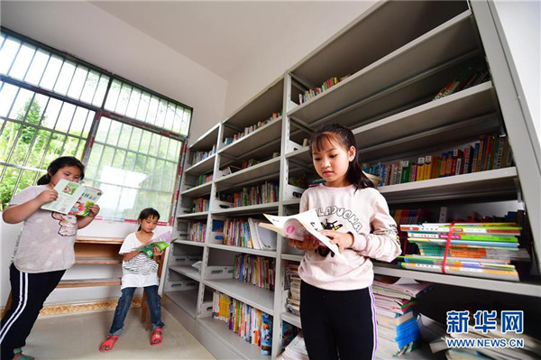 在廣西融水苗族自治縣桿洞鄉(xiāng)黨鳩小學,學生們在圖書室里閱讀(5月13日攝)。新華社記者黃孝邦攝