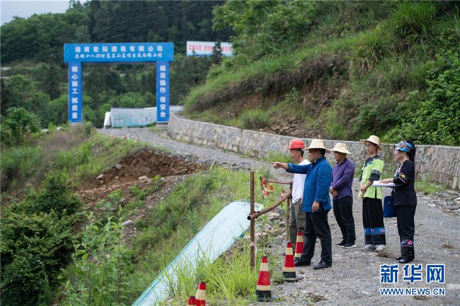 5月15日,在湘西十八洞村溶洞開發(fā)工地,麻輝煌(左二)和村干部進行施工規(guī)劃。新華社發(fā)(陳思汗攝)