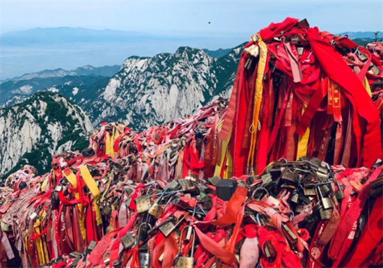 關(guān)內(nèi)關(guān)外登山路兩側(cè)鐵索上情侶鎖、平安鎖,重重疊疊,紅繩彩線迎風(fēng)搖曳,寄托了大家種種情思和愿望,形成了獨(dú)特的鎖文化。