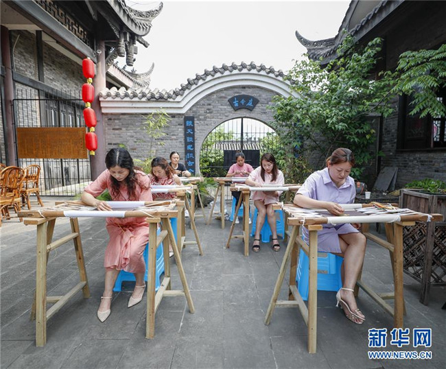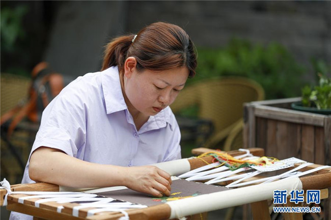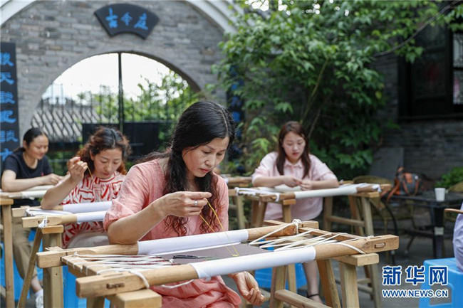 5月23日,在重慶市開(kāi)州區(qū)古今庭漢繡培訓(xùn)中心,漢繡繡娘在繡制文創(chuàng)產(chǎn)品。新華社發(fā)(黃偉 攝)
