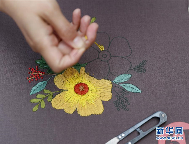 5月23日,在重慶市開(kāi)州區(qū)古今庭漢繡培訓(xùn)中心,漢繡繡娘在繡制文創(chuàng)產(chǎn)品。 新華社發(fā)(黃偉 攝)