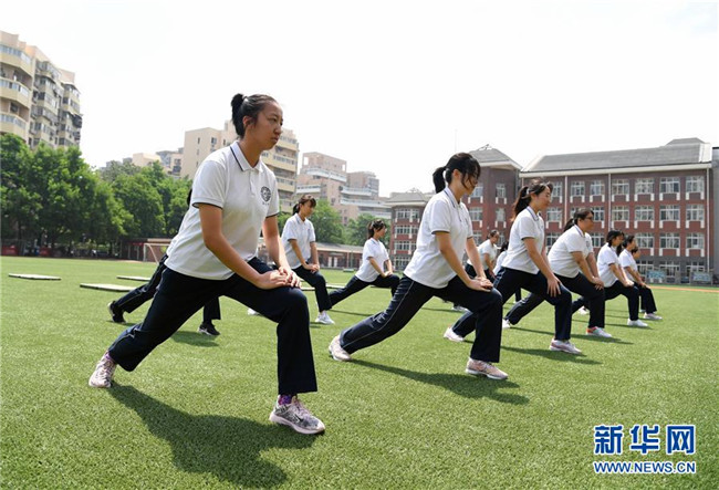 5月28日,北京市第十八中學(xué)初三年級的學(xué)生在體育課上做準(zhǔn)備活動(dòng)。新華社記者 任超 攝