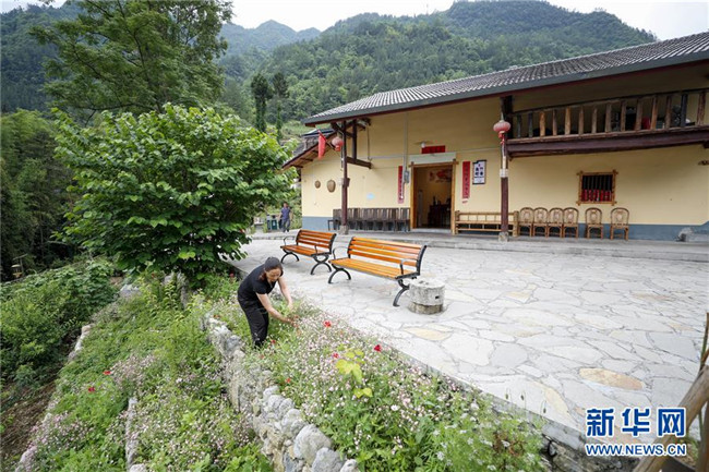 5月28日,重慶市巫溪縣紅池壩鎮(zhèn)龍臺(tái)村村民在打理自家屋前的小花園。新華社發(fā)(黃偉 攝)
