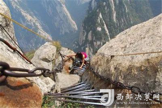 華山還有一處常人不敢涉足的險境--- 鷂子翻身。鷂子翻身在華山東峰是通往下棋亭的必由之路。其路鑿于懸崖上,下視唯見寒索垂于凌空,不見路徑。游人至此,需面壁挽索,以腳尖探尋石窩,交替而下,其中幾步需如鷹鷂一般、左右翻轉身體才可通過。此景只留英雄客,婦孺難聞幾聲咳。這句話現(xiàn)在也未然,巾幗不讓須眉,以后應是往來無懼者,皆是英雄客了。