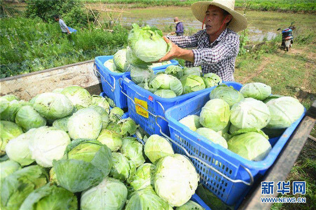 6月4日,在湘潭市雨湖區(qū)鶴嶺鎮(zhèn)龍安村,湘潭市仙女蔬菜產(chǎn)銷專業(yè)合作社的農(nóng)戶將采摘的包菜裝車。新華社記者 陳澤國(guó) 攝
