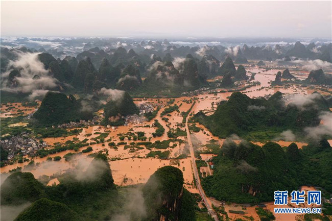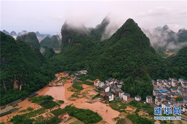 這是廣西陽朔縣部分出現嚴重積水的村莊(6月7日攝,無人機照片)。 新華社記者 陸波岸 攝