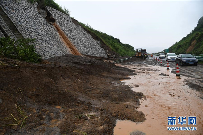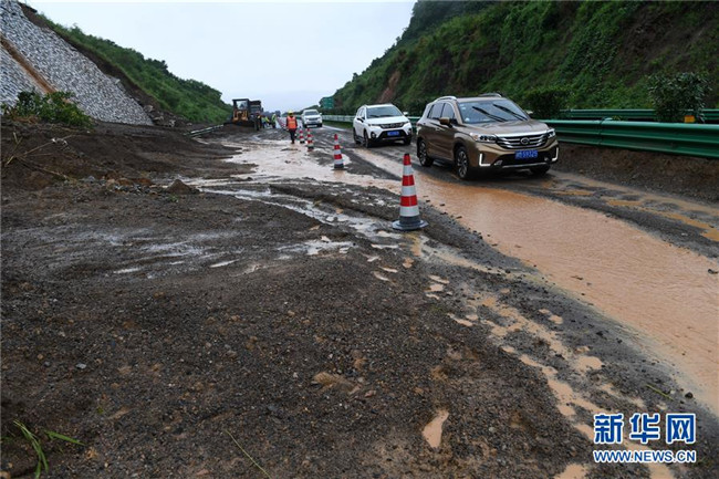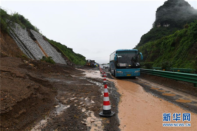 6月7日,在廣西鹿寨至陽朔的高速公路上,車輛從一處發(fā)生滑坡的路段經過。新華社記者 陸波岸 攝