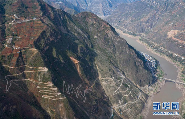 金陽縣蘆稿鎮(zhèn)大灣子村12公里左右的通村公路,28個彎蜿蜒盤旋在金沙江峽谷懸崖絕壁邊(6月7日攝,無人機照片)。坐落在金沙江畔的四川省金陽縣是國家級深度貧困縣,境內(nèi)群山連綿起伏,海拔落差大,眾多村寨處于高山或者高半山上,道路施工難度大。近年來,當(dāng)?shù)卣畬⒔煌ㄗ鳛槊撠毠缘南葘?dǎo)性工程,路越修越寬、越修越好,成為當(dāng)?shù)厝罕姷拿撠氈赂宦?。截?019年底,金陽縣實現(xiàn)所有鄉(xiāng)鎮(zhèn)通油路、建制村通硬化路,鄉(xiāng)道里程達329.9公里,村道里程達866.8公里。新華社記者江宏景攝