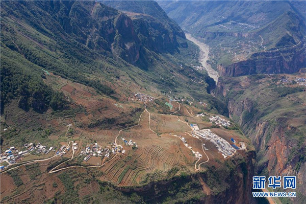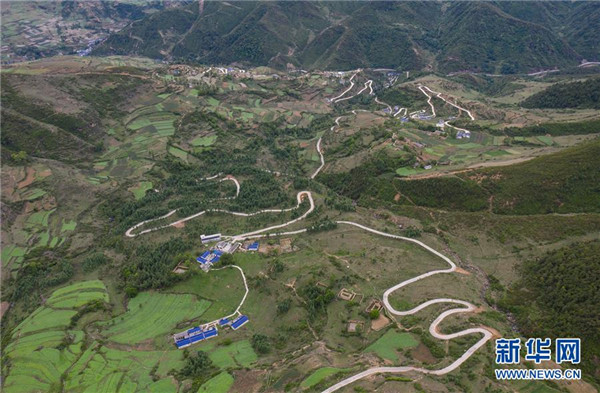 金陽縣天地壩鎮(zhèn)通往吉史里口村易地扶貧搬遷集中安置點的道路(6月7日攝,無人機照片)。坐落在金沙江畔的四川省金陽縣是國家級深度貧困縣,境內(nèi)群山連綿起伏,海拔落差大,眾多村寨處于高山或者高半山上,道路施工難度大。近年來,當(dāng)?shù)卣畬⒔煌ㄗ鳛槊撠毠缘南葘?dǎo)性工程,路越修越寬、越修越好,成為當(dāng)?shù)厝罕姷拿撠氈赂宦?。截?019年底,金陽縣實現(xiàn)所有鄉(xiāng)鎮(zhèn)通油路、建制村通硬化路,鄉(xiāng)道里程達329.9公里,村道里程達866.8公里。新華社記者江宏景攝