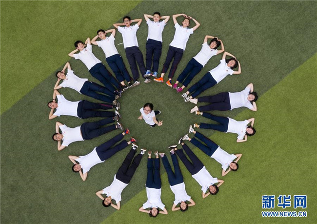 6月9日,河北省衡水市第二中學(xué)的高三學(xué)生在操場(chǎng)上參加減壓趣味游戲(無(wú)人機(jī)照片)。新華社記者 朱旭東 攝