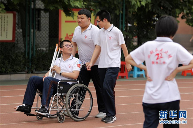 6月9日,河北省衡水市第二中學(xué)的高三學(xué)生推著一名腳部受傷的同學(xué)在操場(chǎng)上聊天散步。新華社記者 朱旭東 攝