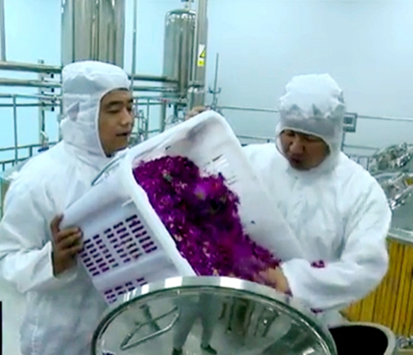 永登縣大手印玫瑰生產(chǎn)加工有限公司在工藝升級后,產(chǎn)能隨之?dāng)U大,收購的鮮花量達(dá)到800噸,能夠幫助苦水鎮(zhèn)新屯川村和上新溝村3000戶花農(nóng)增收致富。目前,永登縣玫瑰種植面積達(dá)10.16萬畝,帶動建檔立卡貧困戶3000多戶,玫瑰產(chǎn)業(yè)成了當(dāng)?shù)孛撠毐夹】档闹еa(chǎn)業(yè)。