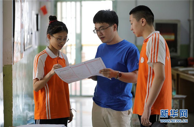 6月18日,河北省衡水市第十四中學(xué)高三年級數(shù)學(xué)老師(中)為學(xué)生講解試題。