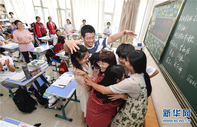 7月6日,吉林省孤兒學校高三年級學生與班主任吳東輝相擁慶祝畢業(yè)。 新華社記者 許暢 攝