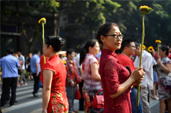 ▲考場外的家長穿著旗袍,手舉向日葵,寓意“旗開得勝”“一舉奪魁”。圖片來源:中新社