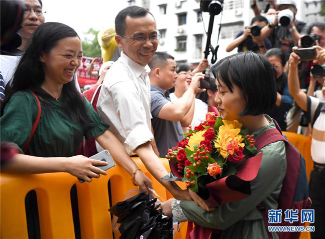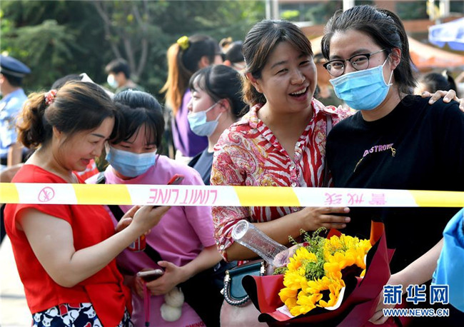 7月8日,一名考生(右)在湖南省長(zhǎng)沙市一中考點(diǎn)外從家長(zhǎng)手中接過鮮花。 當(dāng)日,全國(guó)部分地區(qū)2020年高考結(jié)束。 新華社記者 薛宇舸 攝