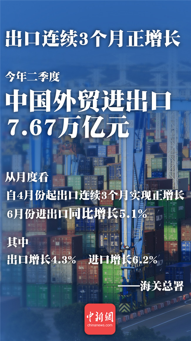 出口連續(xù)3個月正增長。海關總署數(shù)據(jù)顯示,上半年外貿(mào)進出口整體表現(xiàn)好于預期。6月份當月進出口實現(xiàn)年內(nèi)首次雙雙正增長。出口自4月份起連續(xù)三個月保持同比正增長。
