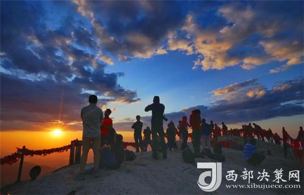 由于華山最高海拔2154.9米,東峰朝陽臺(tái)又居高臨險(xiǎn),視野開闊,故為觀日出之最佳位置。旅游季節(jié),每日黎明時(shí)分,朝陽臺(tái)上,游人濟(jì)濟(jì),翹首以待這最輝煌、最壯觀的一刻。